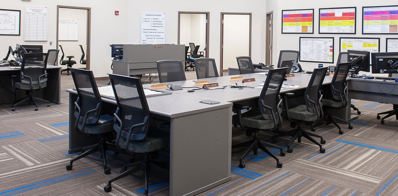 The new facility is comprised of a muster area, field monitoring storage, an emergency operations floor, an NRC room, data rooms, security and other support spaces. Additionally, the sitework performed by Carlin included the creation of parking for up to 75 vehicles.