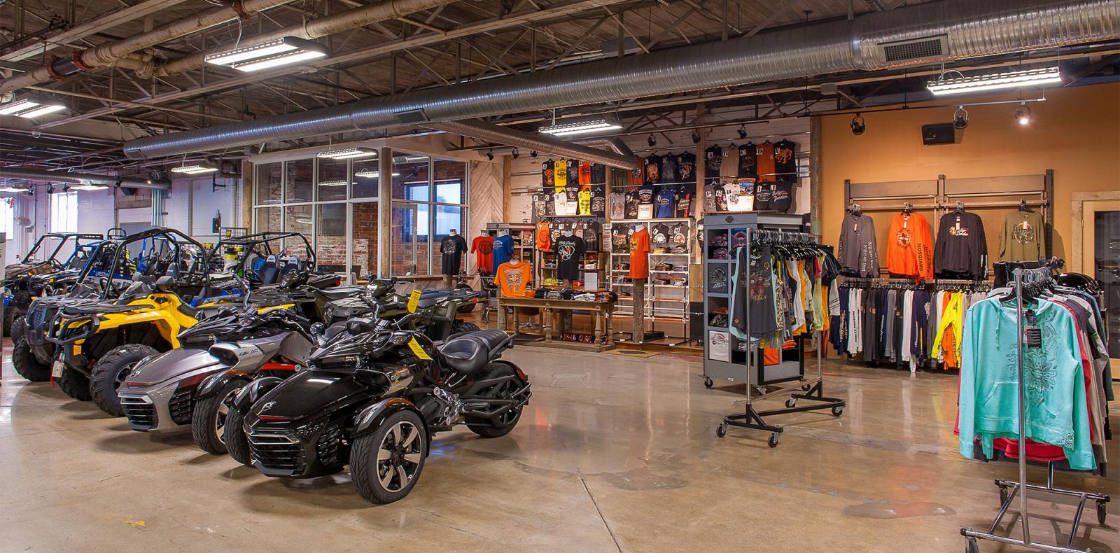 Major components of the adaptive reuse execution included earthwork, sidewalks, demolition, asbestos removal and building envelope repairs. In addition to structural modifications, interior work included generous use of reclaimed materials — woods and metals that create an attractive and gritty backdrop for Harley-Davidson and other brands displayed in the space.